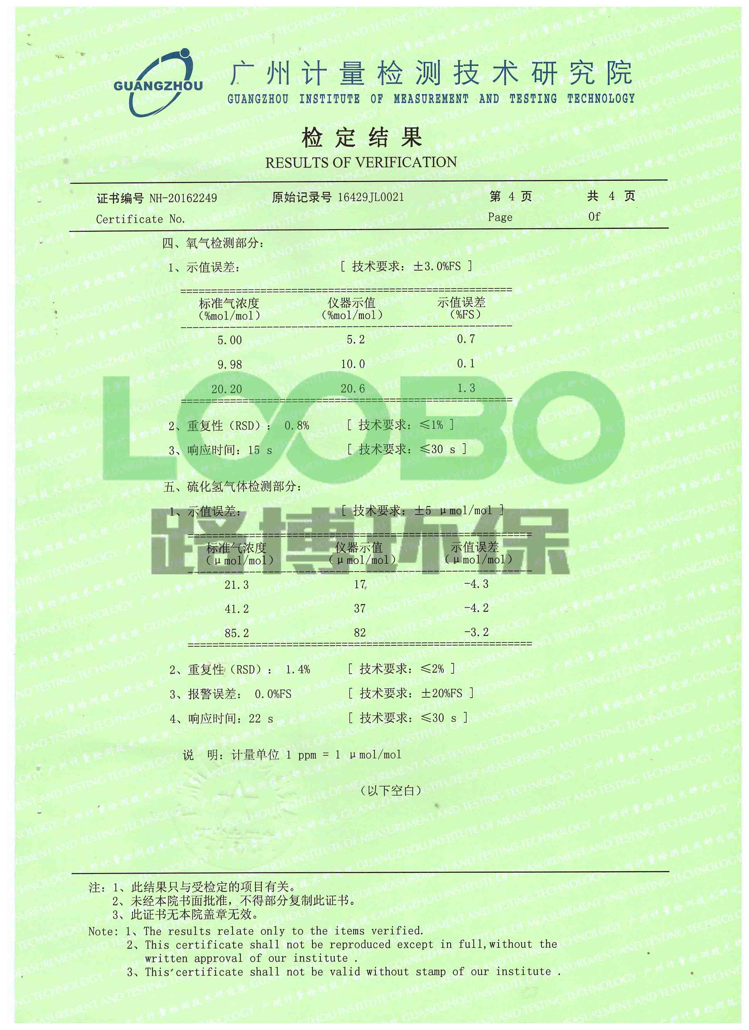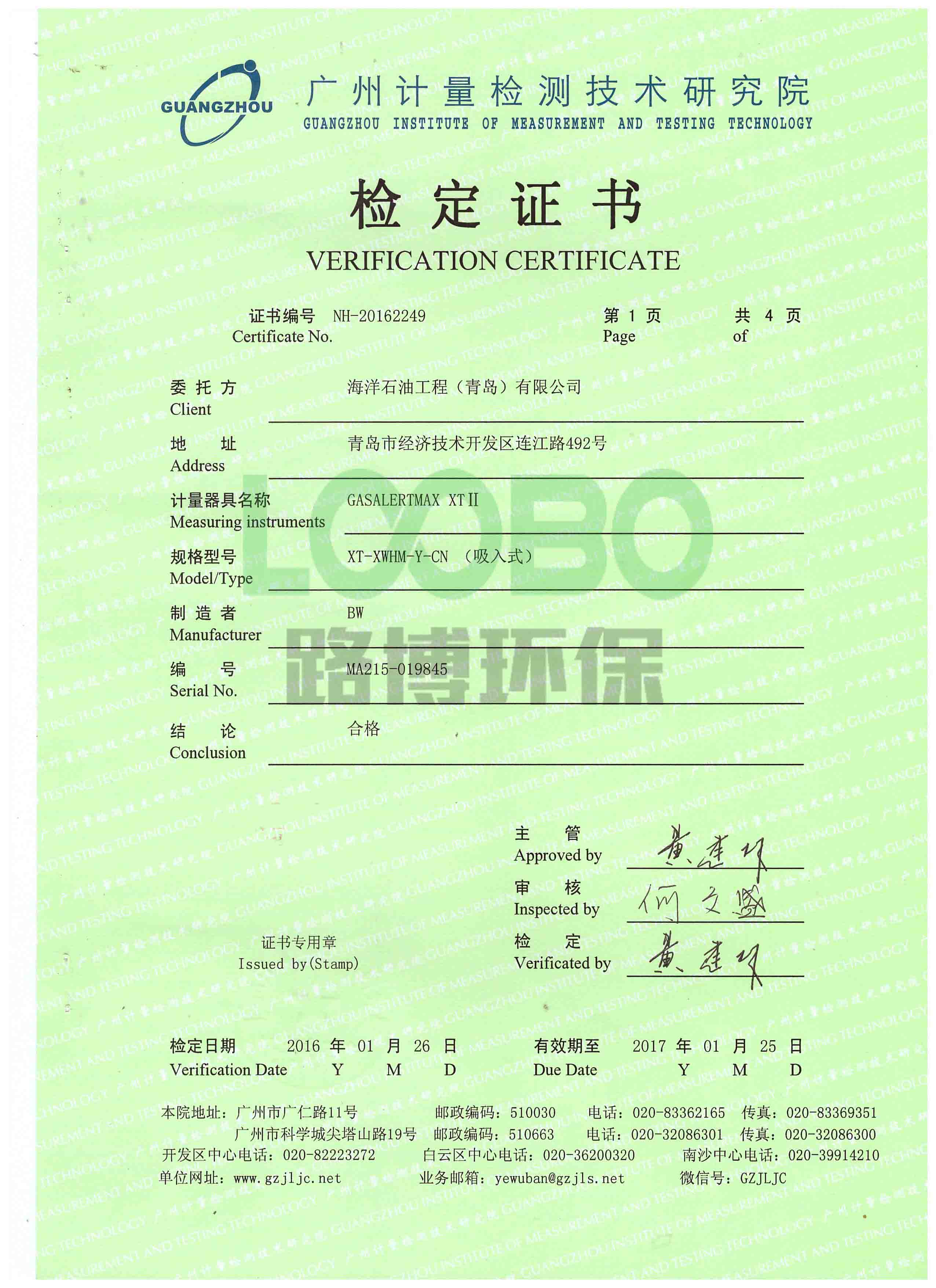 祝賀1月份路博公司送檢的一批四合一氣體檢測儀通過計量。