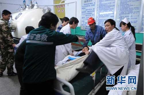 在汾西礦業(yè)集團總醫(yī)院,醫(yī)護人員正在對7名剛從介休市人民醫(yī)院轉至該院急救室的受傷人員進行高壓氧、防止腦水腫等緊急治療。該院一位值班醫(yī)生告訴記者,目前這7名傷者生命體征正常,情緒穩(wěn)定。