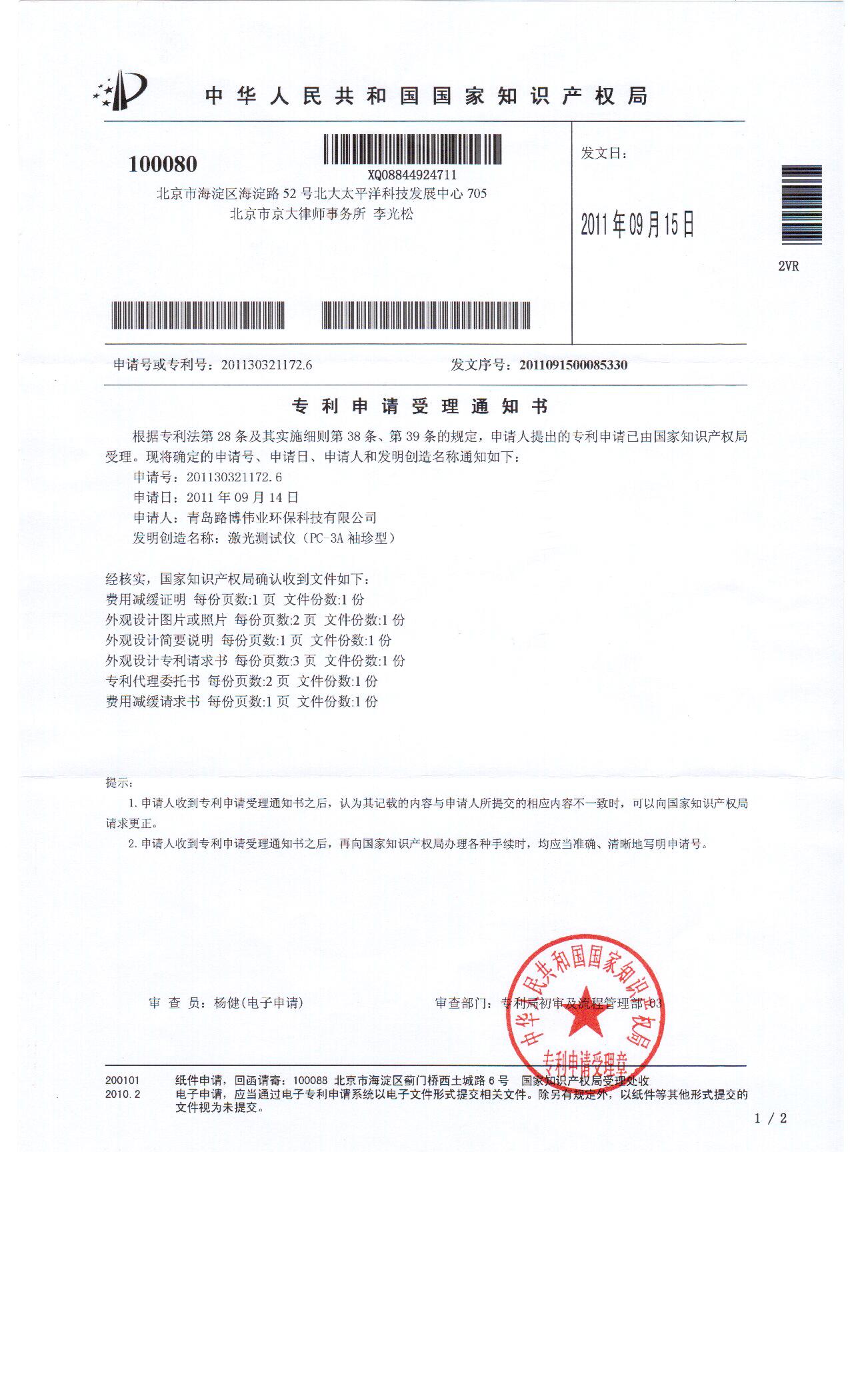 儀器儀表二部PC-3A激光粉塵測試儀外觀專利申請已成功通過國家知識產權受理