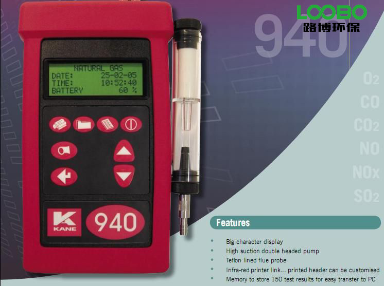 KANE940煙氣分析儀簡(jiǎn)介 ·用于鍋爐的燃燒測(cè)試和煙氣污染排放監(jiān)測(cè) ·體積小巧,操作簡(jiǎn)單,同時(shí)顯示多組分測(cè)量結(jié)果 ·可同時(shí)測(cè)量O2和3個(gè)污染氣體以及煙氣溫度,環(huán)境溫度,煙道壓力 ·傳感器 SO2, CO, NO, NO2 任選1-3個(gè)靈活組合 ·強(qiáng)力內(nèi)置泵,保證大負(fù)壓下的正常測(cè)量 ·極大地減少了SO2和NOx的管路吸付,保證了測(cè)量精度 ·自動(dòng)計(jì)算CO2,CO/CO2,過(guò)剩空氣系數(shù),燃燒效率 ·隨機(jī)存儲(chǔ)測(cè)試結(jié)果 ·紅外遙控打印方式 ·內(nèi)置電池連續(xù)工作8個(gè)小時(shí)