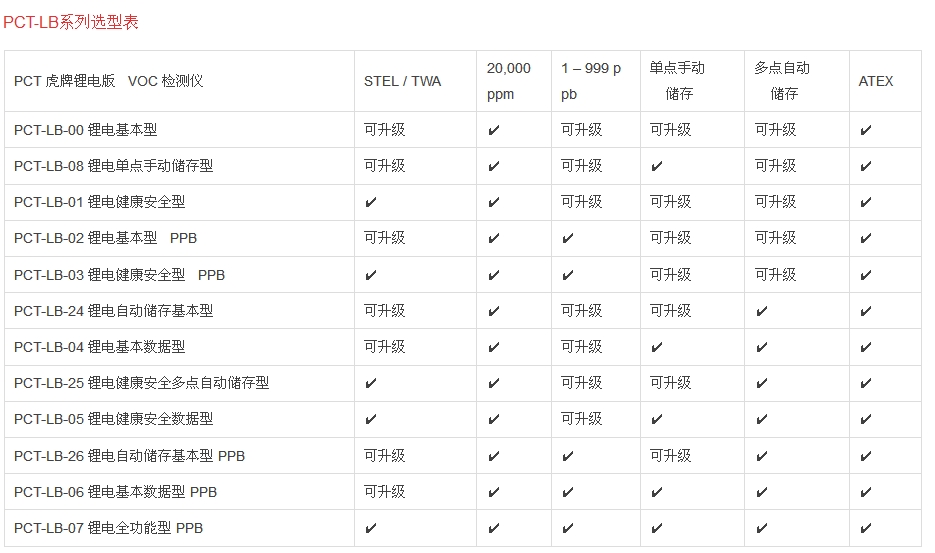 PCT-LB-00 PCT 虎牌基本型有機氣體檢測儀(鋰電版) PCT-LB-01 PCT 虎牌健康安全型有機氣體檢測儀(鋰電版) PCT-LB-02 PCT 虎牌基本型PPB級有機氣體檢測儀(鋰電版) PCT-LB-03 PCT 虎牌健康安全型PPB級有機氣體檢測儀(鋰電版) PCT-LB-04 PCT 虎牌全數據型有機氣體檢測儀(多點自動儲存,單點手動儲存) PCT-LB-05 PCT 虎牌健康安全數據型有機氣體檢測儀(鋰電版) PCT-LB-06 PCT 虎牌基本數據型PPB級有機氣體檢測儀(鋰電版) PCT-LB-07 PCT 虎牌全功能型PPB級有機氣體檢測儀(鋰電版) PCT-LB-08 PCT 虎牌單點手動存儲型有機氣體檢測儀(單點手動儲存) PCT-LB-24 PCT 虎牌基本型自動存儲型有機氣體檢測儀(多點自動儲存) PCT-LB-25 PCT 虎牌健康安全多點自動存儲型有機氣體檢測儀(多點自動儲存)PCT-LB-26 PCT 虎牌鋰電自動儲存基本型PPB級VOC檢測儀(鋰電版)(多點自動儲存)