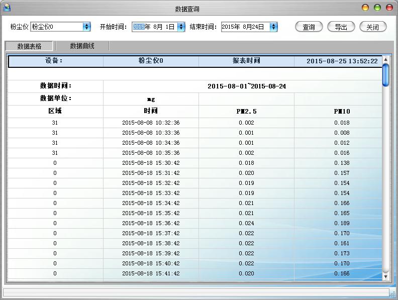 隨LB-3A型粉塵濃度檢測儀到用戶手里的,還有一個數據采集分析軟件,該軟件支持數據采集、數據分析、歷史數據查詢、數據導出等功能,支持表格顯示及曲線顯示方式,用戶只需要將粉塵儀連接到電腦就可以進行實時數據采集,當然,用戶也可以在現場數據采集后,返回基地后再將數據導入到分析軟件。數據分析軟件還可以對粉塵儀進行反向控制,如遠程啟動、遠程停止、遠程讀取等功能。